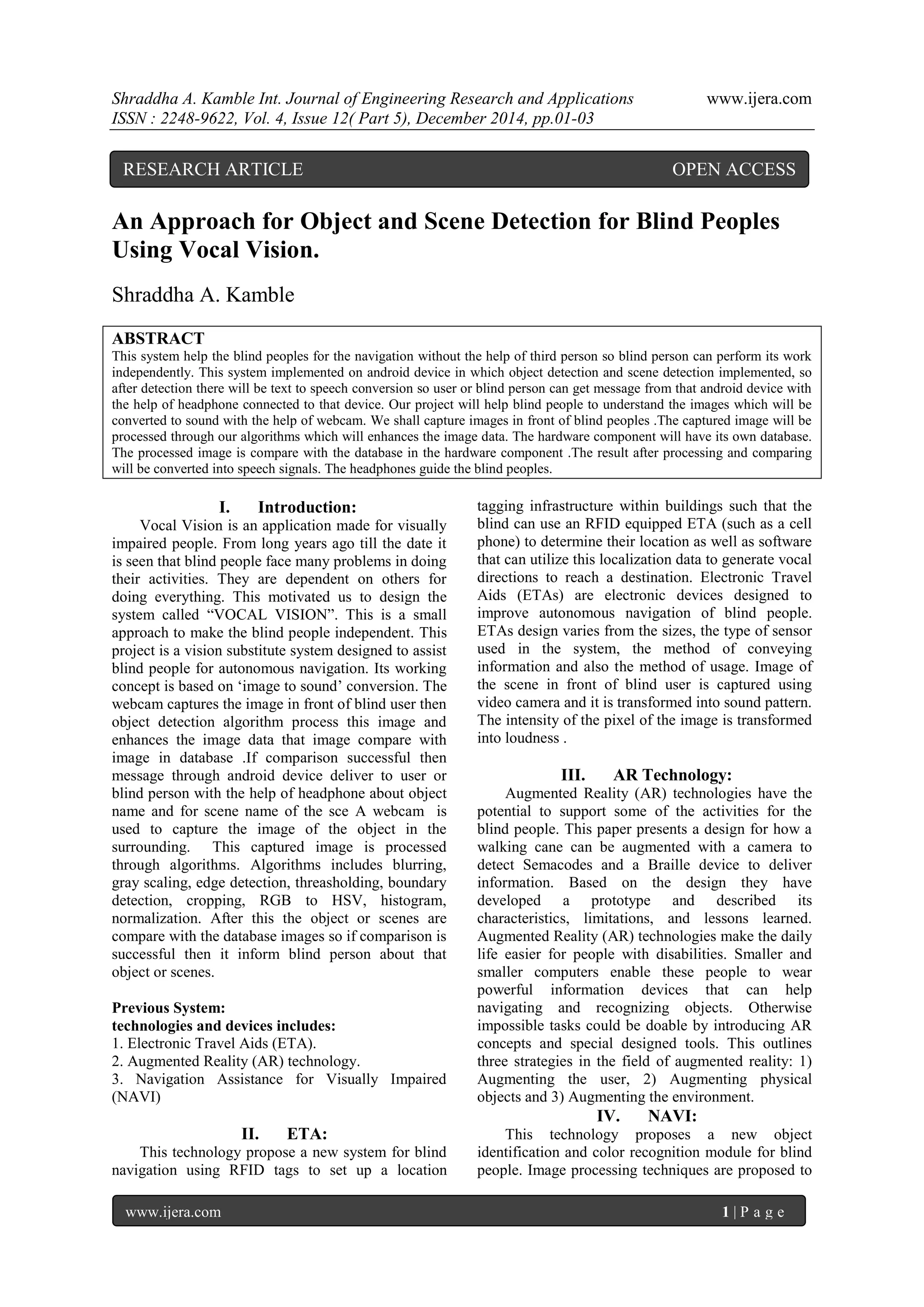 The document discusses the development of a system called 'Vocal Vision' designed to assist blind individuals in navigating independently by converting images to sound through object and scene detection. The system utilizes a webcam and includes various image processing algorithms to enhance image data, which is then compared with a database to provide audio feedback to users. This project aims to empower visually impaired individuals by improving their autonomy and reducing reliance on others for navigation.