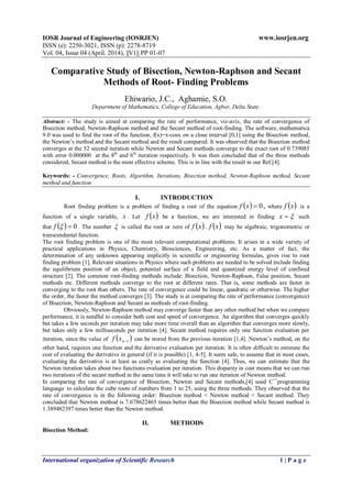The document compares the convergence rates of the bisection, Newton-Raphson, and secant methods for finding roots of functions. It finds the root of the function f(x)=x-cos(x) on the interval [0,1] using each method. The bisection method converges at the 52nd iteration, while Newton-Raphson and secant methods converge to the exact root of 0.739085 with an error of 0 at the 8th and 6th iterations respectively. Therefore, the document concludes that the secant method is the most effective of the three for this problem.