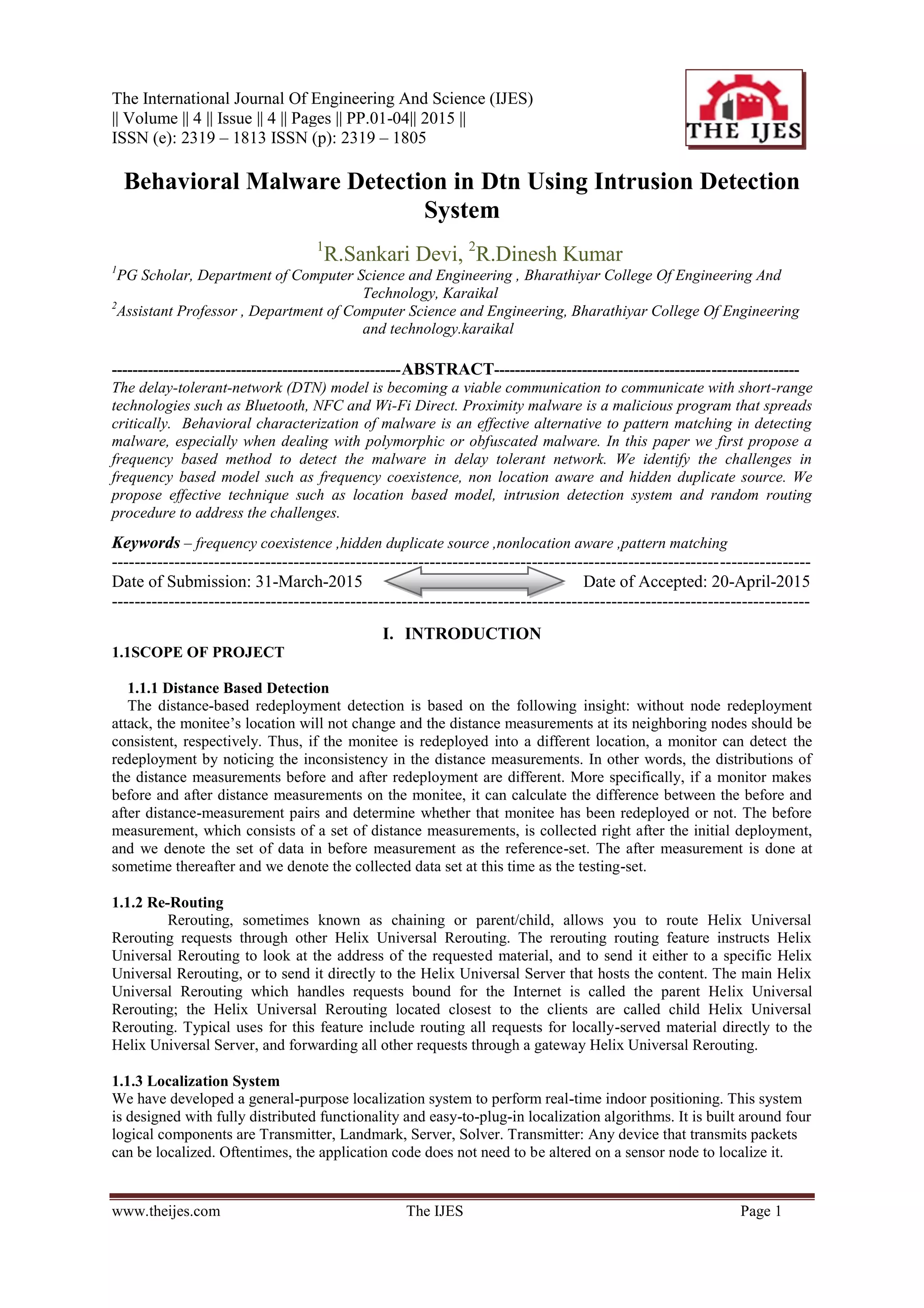 The paper discusses a novel approach for detecting behavioral malware in Delay-Tolerant Networks (DTNs) using an Intrusion Detection System and frequency-based methods. It outlines the challenges faced, such as frequency coexistence and hidden duplicate sources, and proposes techniques like location-based models and random routing procedures to address these issues. The authors emphasize the growing threat of proximity malware due to the increasing prevalence of short-range communication technologies.