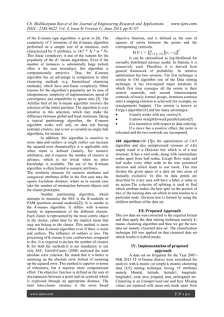The document analyzes crop yield data from spatial locations in Guntur District, Andhra Pradesh, India using hybrid data mining techniques. It first applies k-means clustering to the dataset, producing 5 clusters. It then applies the J48 classification algorithm to the clustered data, resulting in a decision tree that predicts cluster membership based on attributes like crop type, irrigated area, and latitude. Analysis found irrigated areas of cotton and chilies increased from 2007-2008 to 2011-2012. Association rule mining on the clustered data also found relationships between productivity and location attributes. The hybrid approach of clustering followed by classification effectively analyzed the spatial agricultural data.