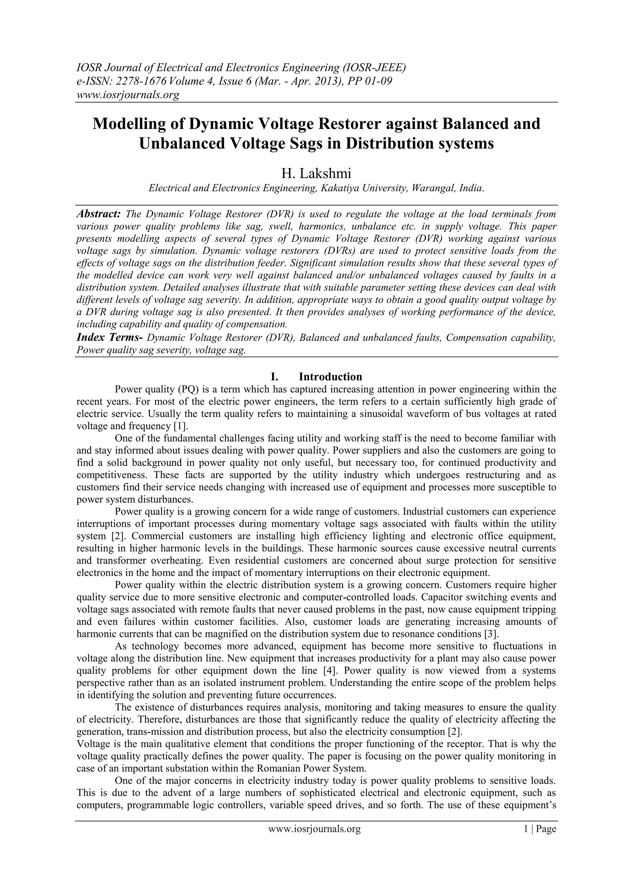 This document summarizes a research paper that models the performance of different types of Dynamic Voltage Restorers (DVRs) in mitigating balanced and unbalanced voltage sags on distribution systems. The paper presents modeling aspects of several DVR configurations and analyzes their effectiveness in compensating for various voltage sag scenarios through detailed simulation results. It also discusses the capability of DVRs to regulate voltage quality at load terminals during power quality issues like sags, swells and harmonics.