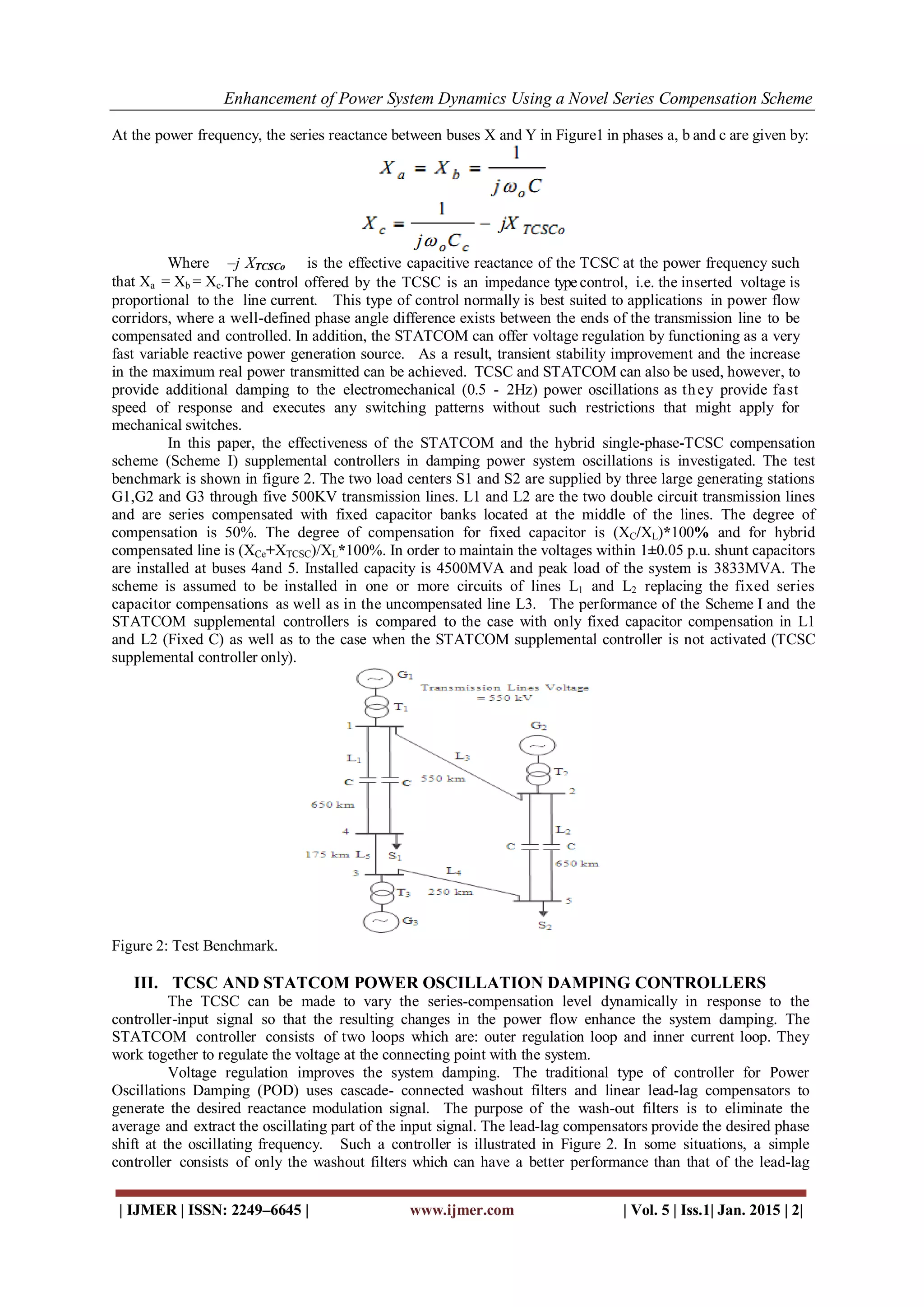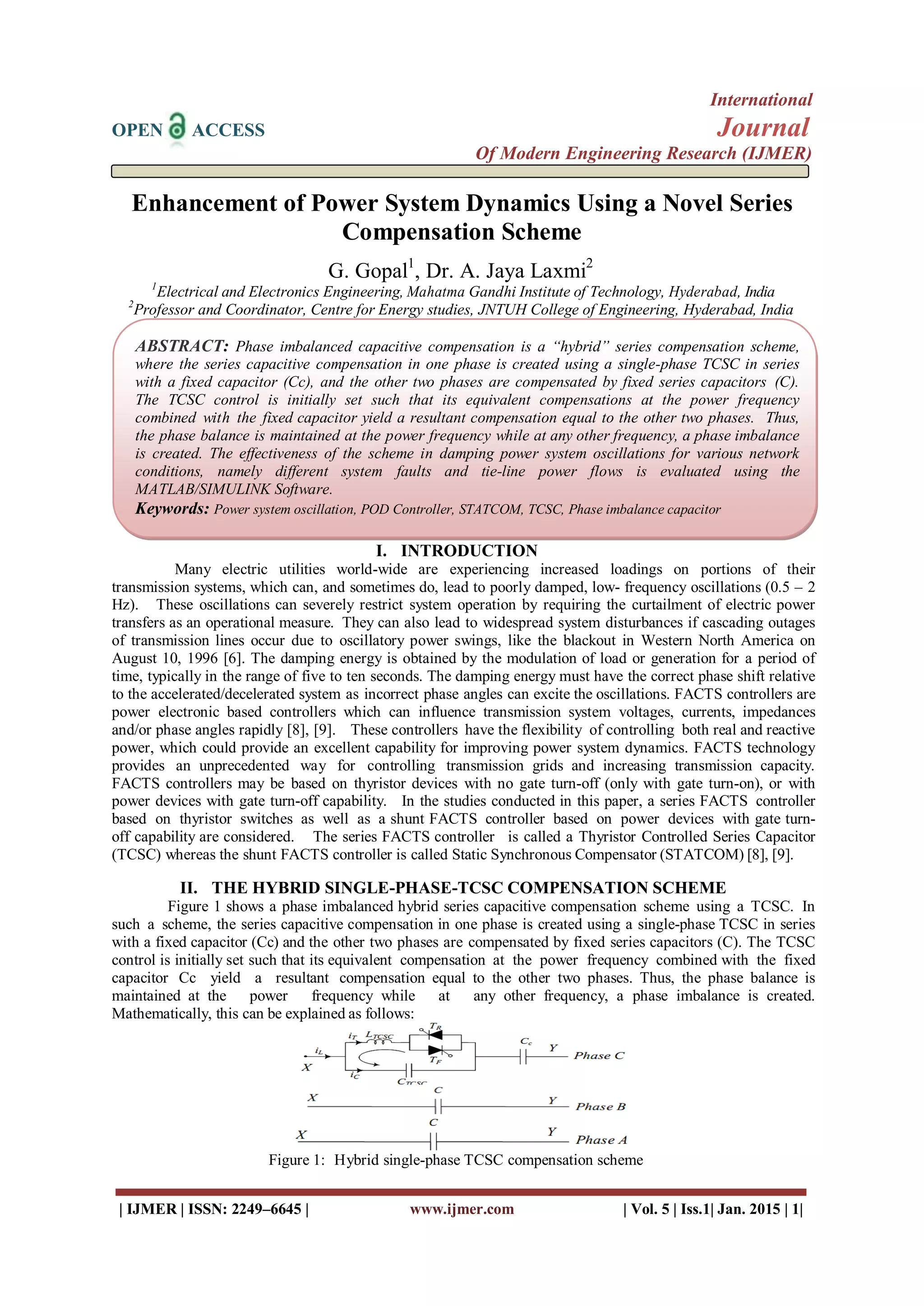 The document discusses a novel series compensation scheme using a thyristor-controlled series capacitor (TCSC) and a static synchronous compensator (STATCOM) to enhance power system dynamics and mitigate low-frequency oscillations in electric utilities. The effectiveness of the hybrid single-phase TCSC scheme is evaluated through simulations under various network conditions, demonstrating improved damping performance compared to traditional fixed capacitor compensation. The findings indicate that optimizing the ratio of TCSC to fixed capacitor compensation significantly improves transient stability and reliability of the power system.