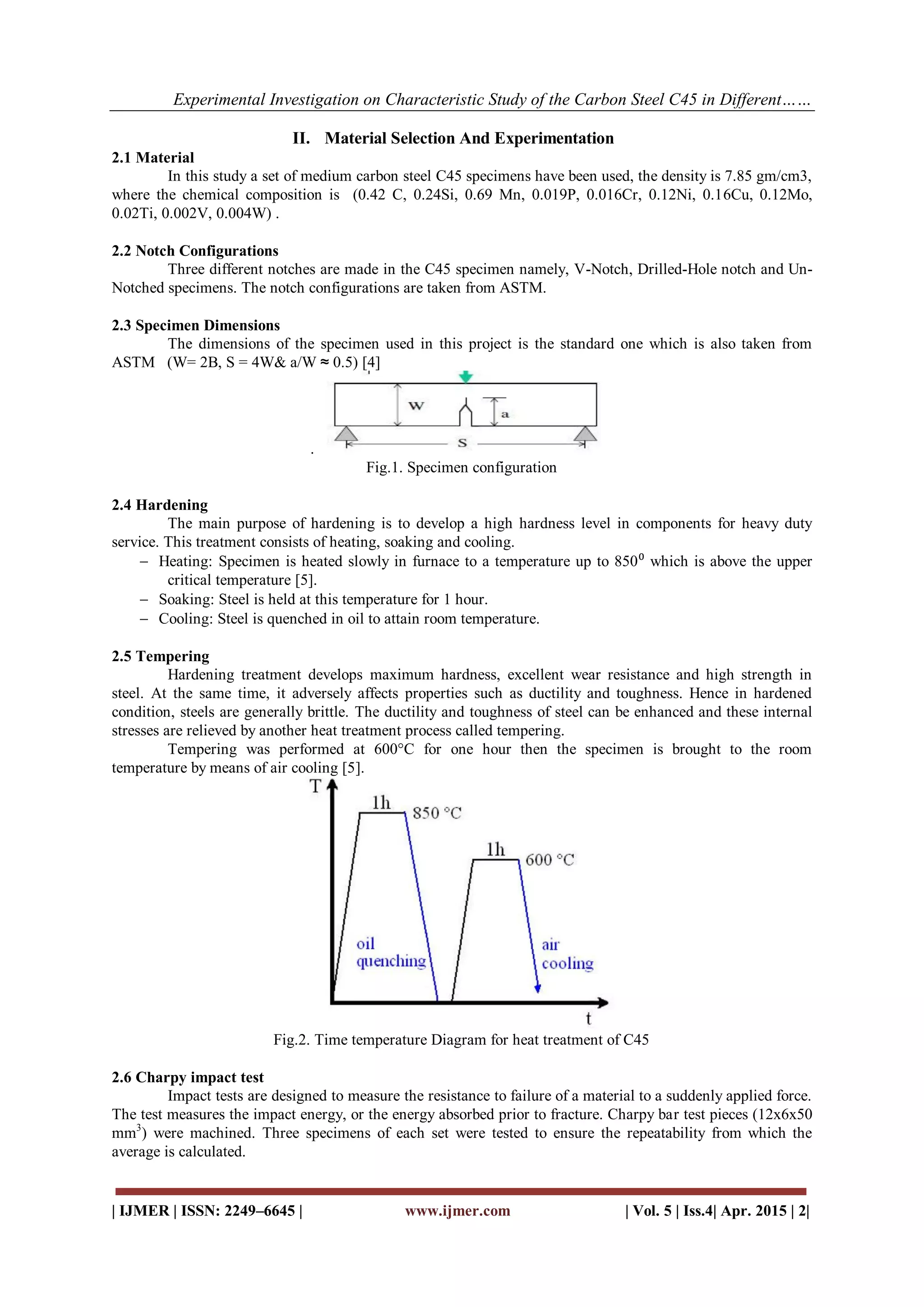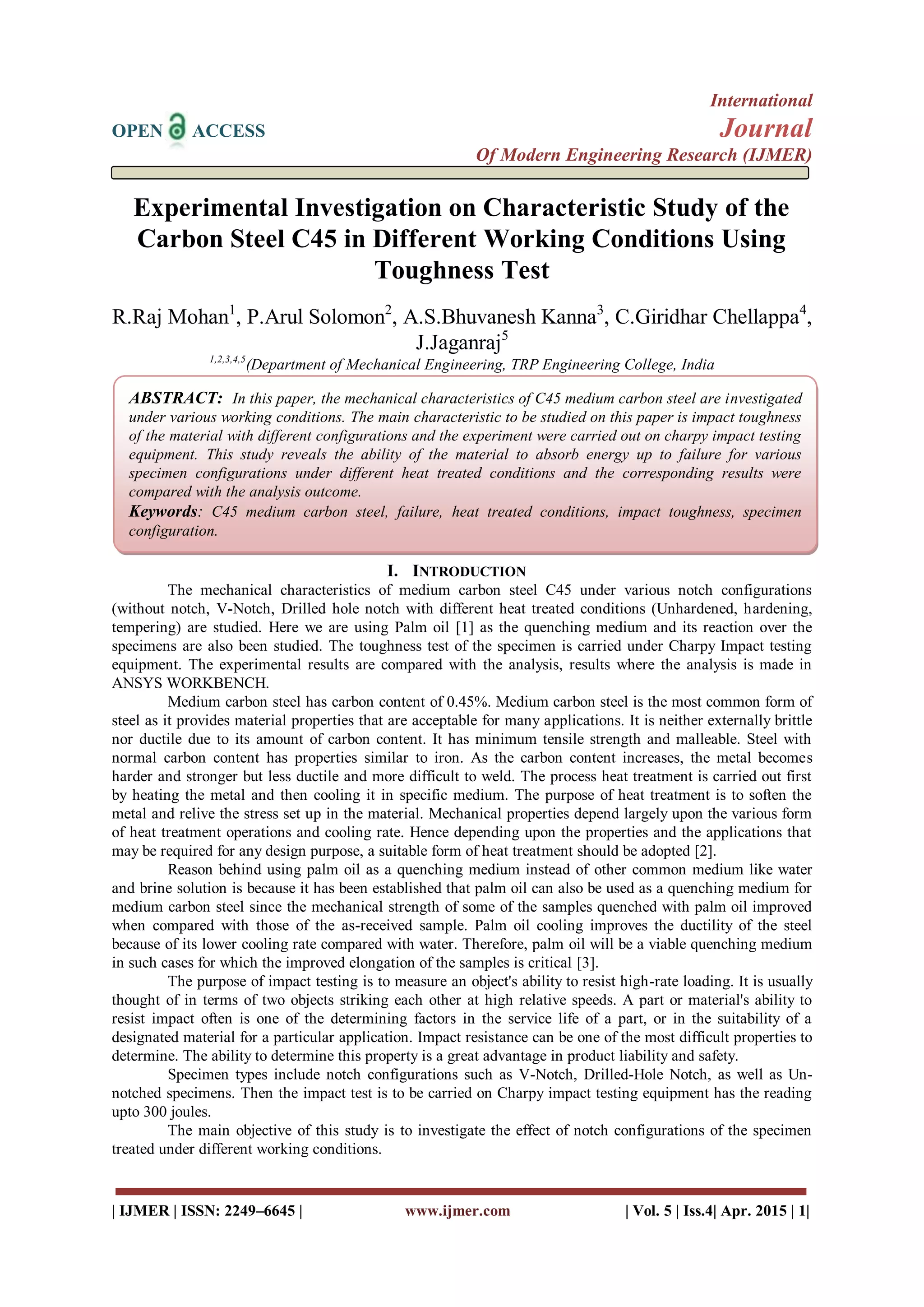 This study investigates the mechanical characteristics of medium carbon steel C45 under various notch configurations and heat treatments using Charpy impact testing. It compares the impact toughness and energy absorption of treated specimens quenched in palm oil versus traditional methods, revealing that palm oil enhances ductility. The results demonstrate that heat-treated specimens exhibit greater toughness, with drilled hole notches outperforming V-notches in impact strength.
