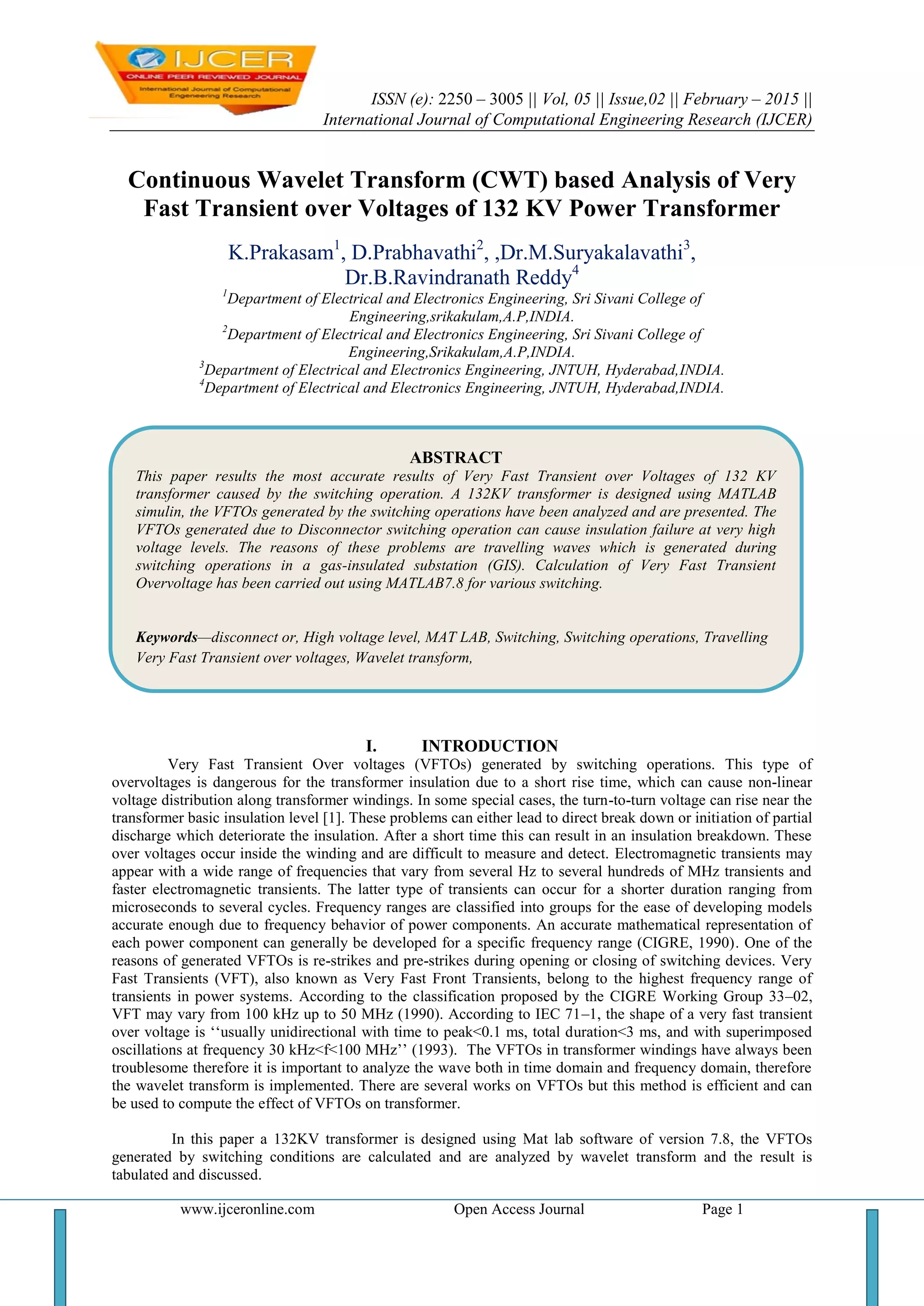 This document presents a study on analyzing very fast transient overvoltages (VFTOs) of a 132kV power transformer using continuous wavelet transform (CWT). A 132kV transformer model is developed in MATLAB and subjected to switching operations. VFTOs generated are analyzed using CWT and results are compared to conventional methods. CWT provides more accurate results with 2.66% lower VFTO magnitudes and 5.3% faster rise times. The study concludes CWT is more efficient than conventional techniques for analyzing transformer VFTOs.