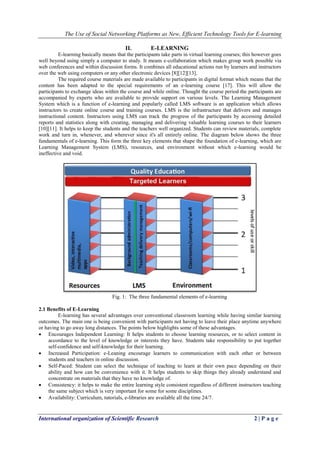 This document discusses using social networking platforms as new technology tools for e-learning. It begins by introducing how social networks have made connecting people globally easier and cheaper. It then discusses how e-learning through web-based learning systems provides advantages for both teachers and students by allowing flexibility. The popularity of using social networks as an educational tool is increasing as educators incorporate platforms like Facebook and LinkedIn into learning. A study examined students' usage of learning management systems versus social networks for educational purposes. It found that social networks were used more regularly and seen as more useful and effective for spreading information among students. The conclusion is that while some students still prefer learning management systems, social networks can provide a richer environment for sharing knowledge between educators and peers