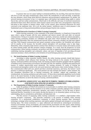 This document discusses the vital roles of learning assistants in online learning communities, highlighting their functions in providing emotional support and academic assistance. It emphasizes the need for effective strategies to address learners' emotional challenges and enhance their learning experiences. The paper includes a survey analyzing the emotional problems faced by online learners and proposes methods for improving the organization and maintenance of online learning communities.