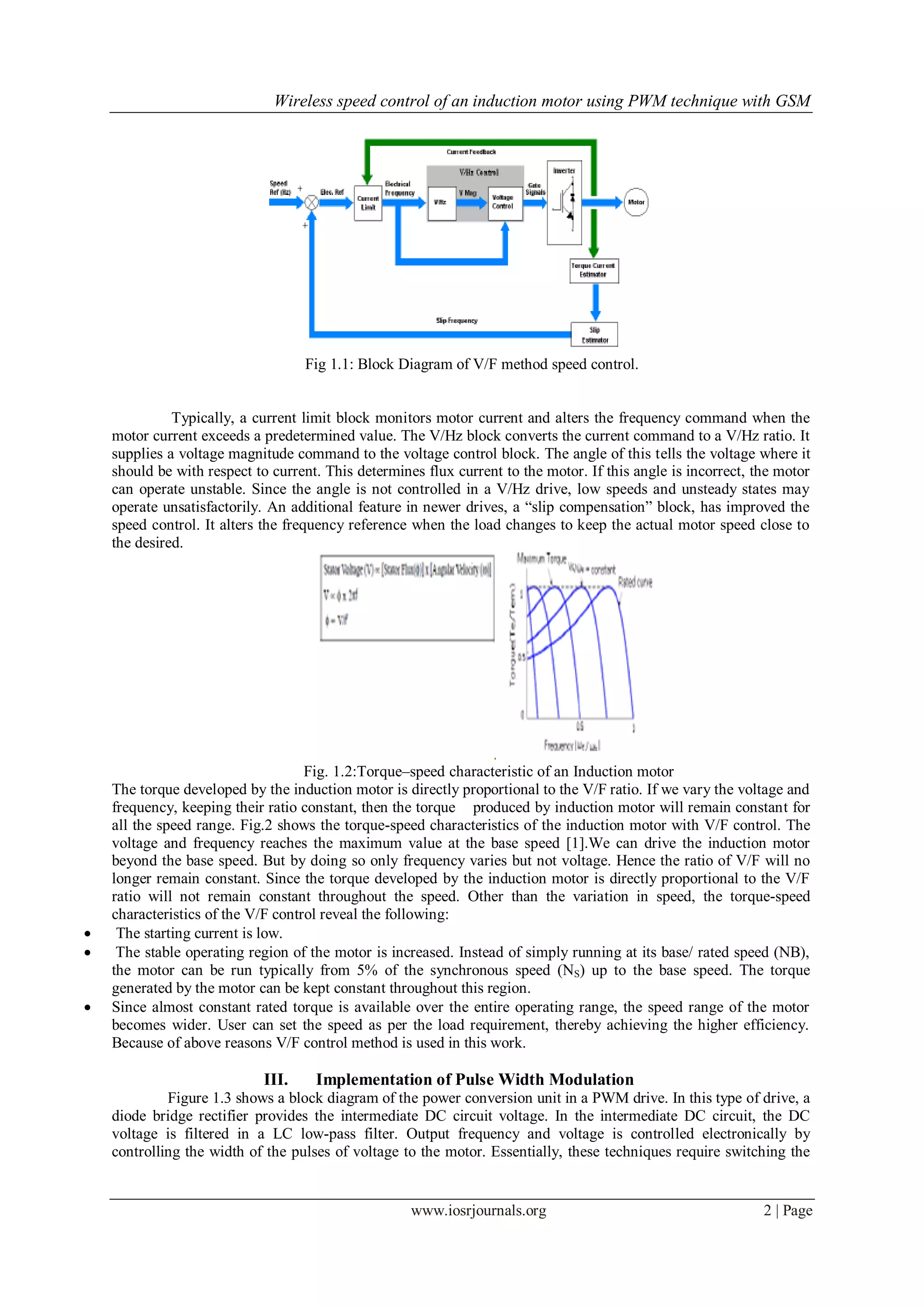 This document describes a wireless speed control system for an induction motor using pulse width modulation (PWM) technique with global system for mobile communications (GSM). The system uses a microcontroller to control IGBT inverters and implement volt-hertz (V/F) control of a 1HP 3-phase induction motor. It can remotely control motor speed by sending SMS messages to the controller via GSM. Experimental results show that the V/F control method maintains a constant voltage-to-frequency ratio to provide stable speed control of the induction motor from 5% to 100% of its base speed range. The system provides a low-cost solution for remote wireless control of industrial motors and appliances.