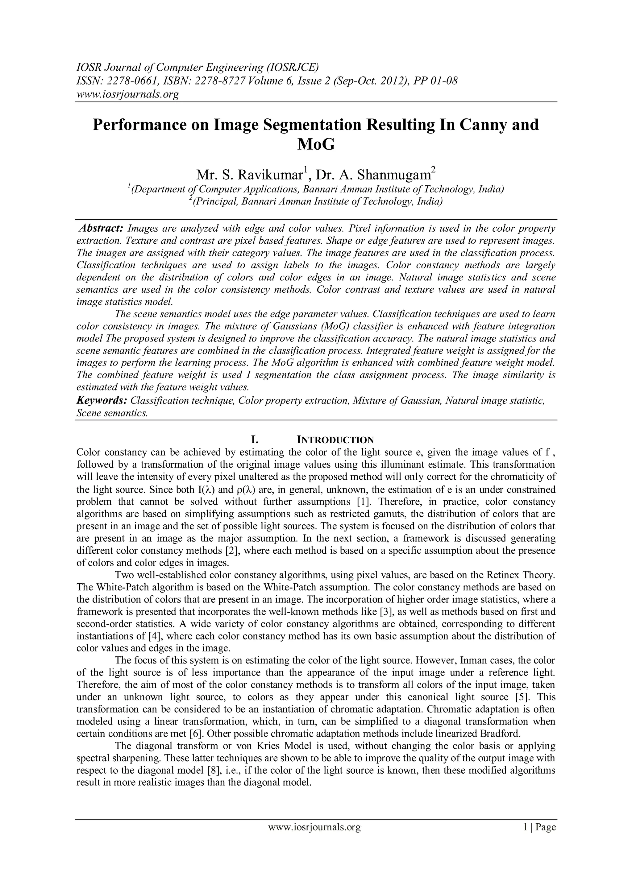 The document discusses image segmentation techniques using the Canny edge detector and Mixture of Gaussians (MoG) classifier. It begins with an abstract discussing how images are analyzed using features like edges, color, texture, and shape. It then discusses the Canny edge detector, noting it was developed to detect a wide range of edges in a multi-stage algorithm. The document focuses on improving image classification accuracy by combining natural image statistics and scene semantics features in a MoG classifier with an integrated feature weighting model.