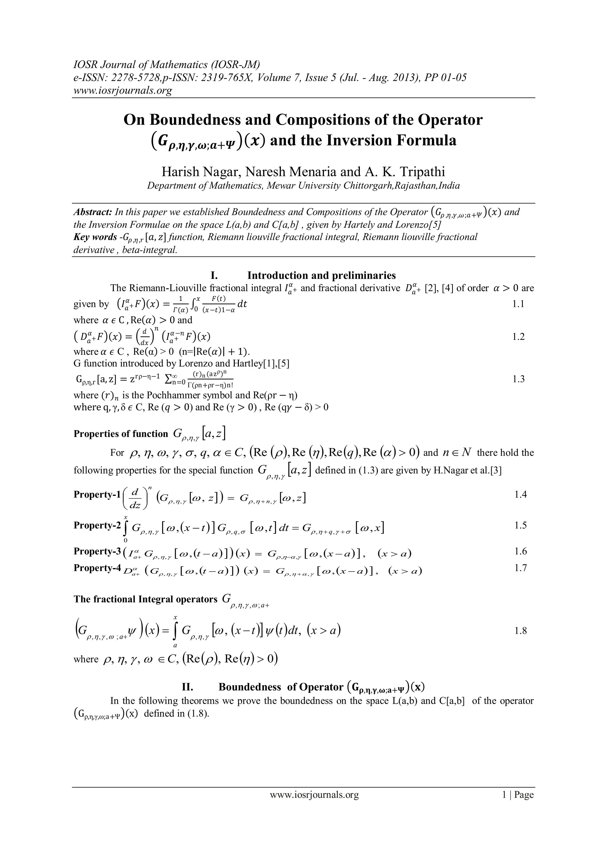 This document presents theorems establishing the boundedness and compositions of the operator Gρ,η,γ,ω;a+Ψ(x) on the spaces L(a,b) and C[a,b]. Specifically: