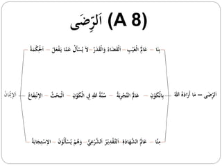 Dokumen ini membahas prinsip kerelaan (ridho) kepada takdir Allah, yang mencakup penerimaan apa yang telah ditentukan-Nya untuk diri kita dan alam semesta. Pengetahuan tentang qadha dan takdir merupakan kunci untuk mengembangkan sikap syukur dan sabar, terlepas dari baik atau buruknya keadaan yang menimpa. Selain itu, dokumen ini menekankan pentingnya doa sebagai bagian dari ibadah, meskipun qadha-qadar sudah ditetapkan, serta menjelaskan proses pengabulan doa dalam konteks hikmah dan rahmat Allah.