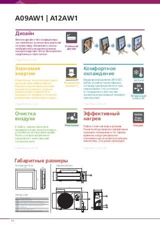 Бытовые кондиционеры LG 2014 года, моделируемые в серии Artcool Gallery, сочетают стильный дизайн с функциональностью, включая возможность смены изображений на передней панели и 3D распределение воздуха для максимального комфорта. Инверторная технология позволяет значительно снизить потребление электроэнергии, увеличивая надежность и продлевая срок службы устройства. Эффективные системы фильтрации, включая фильтры plasma и антибактериальные, обеспечивают чистый воздух и комфортное использование.