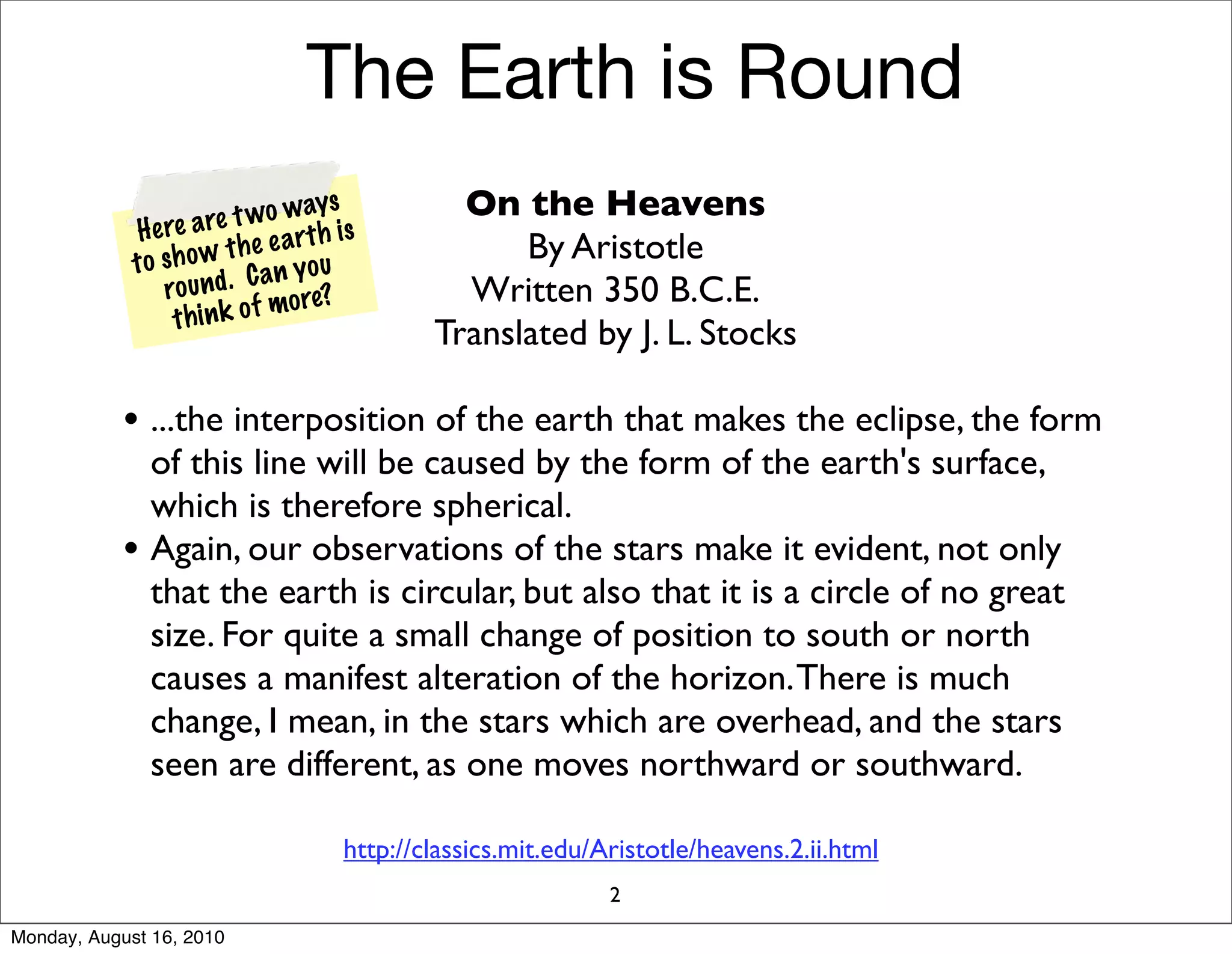 - Aristotle discovered that the Earth is round in 350 BC based on observations of lunar eclipses and changes in stars viewed from different locations.
