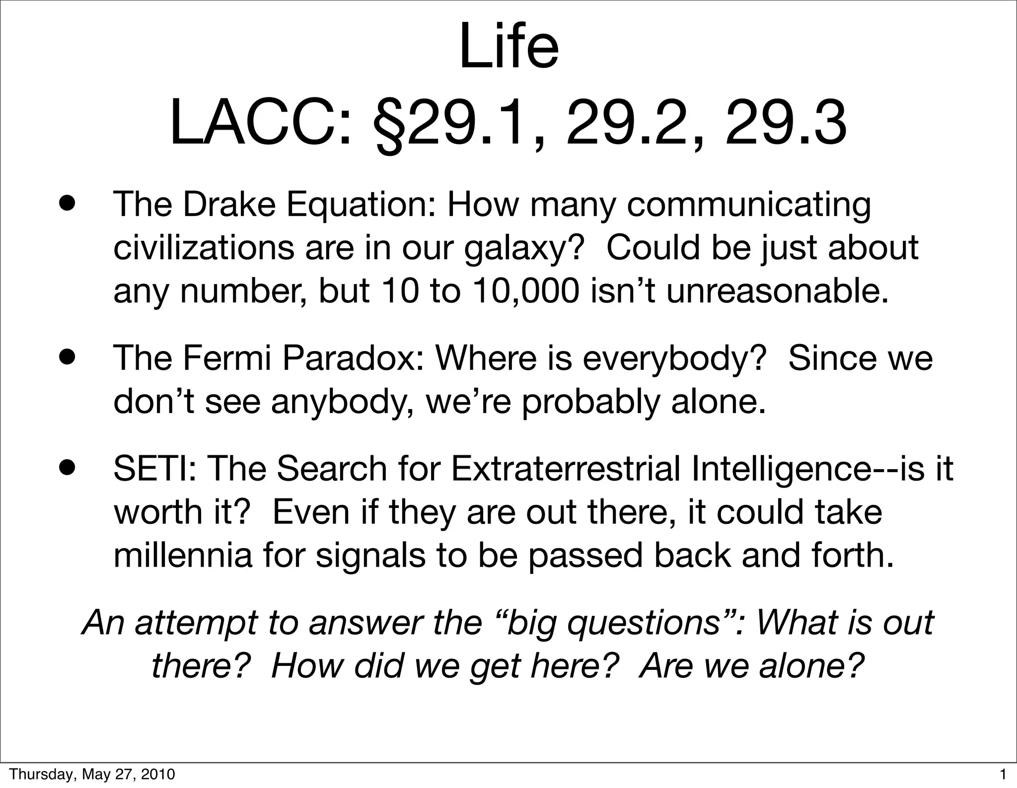The document discusses factors involved in estimating the number of technological civilizations that may exist among stars using the Drake Equation. It examines each variable in the equation - R* (rate of formation of suitable stars), fp (fraction with planets), ne (number of planets suitable for life), fl (fraction where life appears), fi (fraction where intelligent life emerges), fc (fraction emitting detectable signals), and L (length of time signals emitted). It provides estimates and considerations for each variable based on current astronomical and biological understandings.
