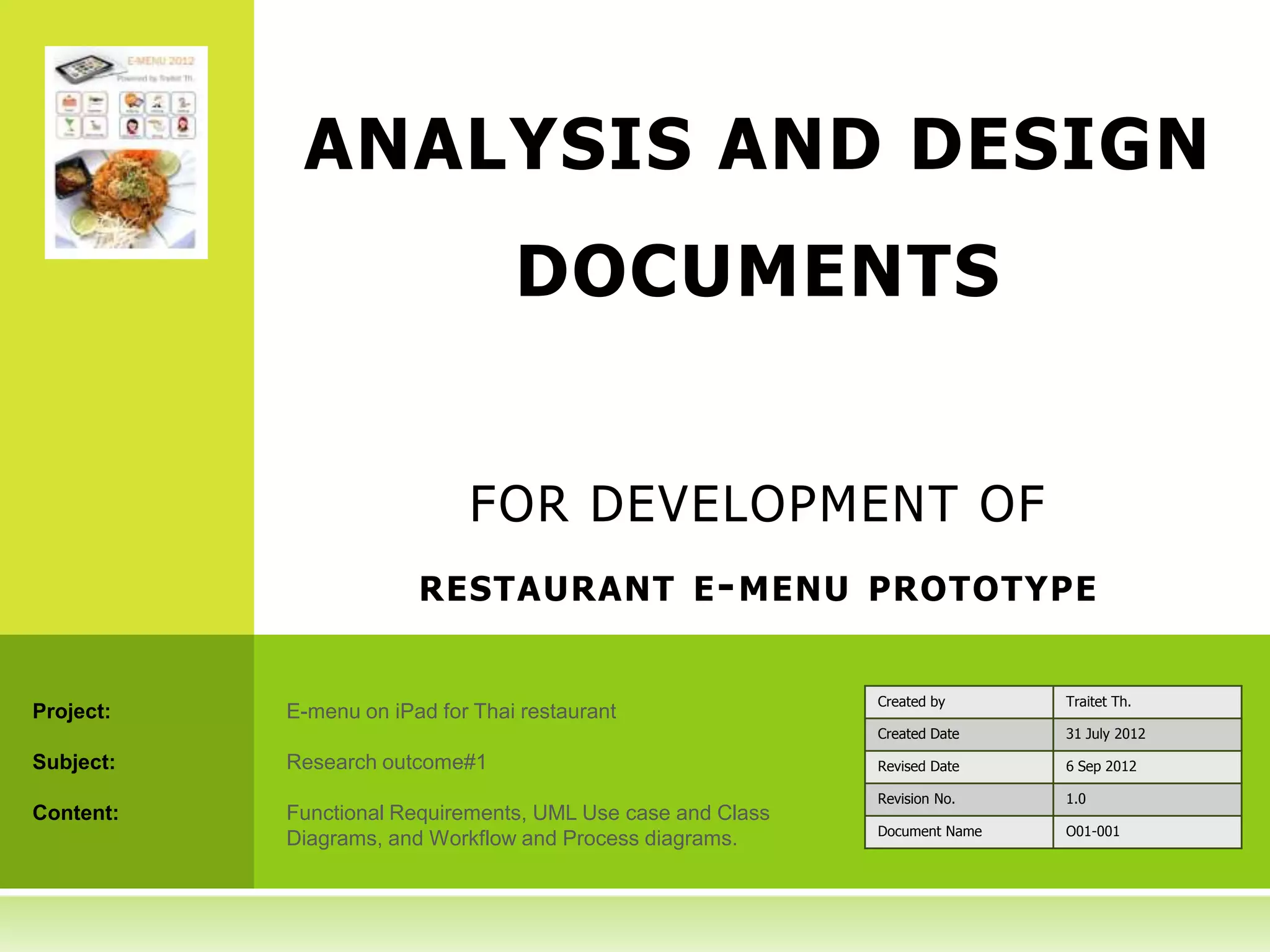 This document provides analysis and design documents for developing an e-menu prototype for a Thai restaurant. It includes: