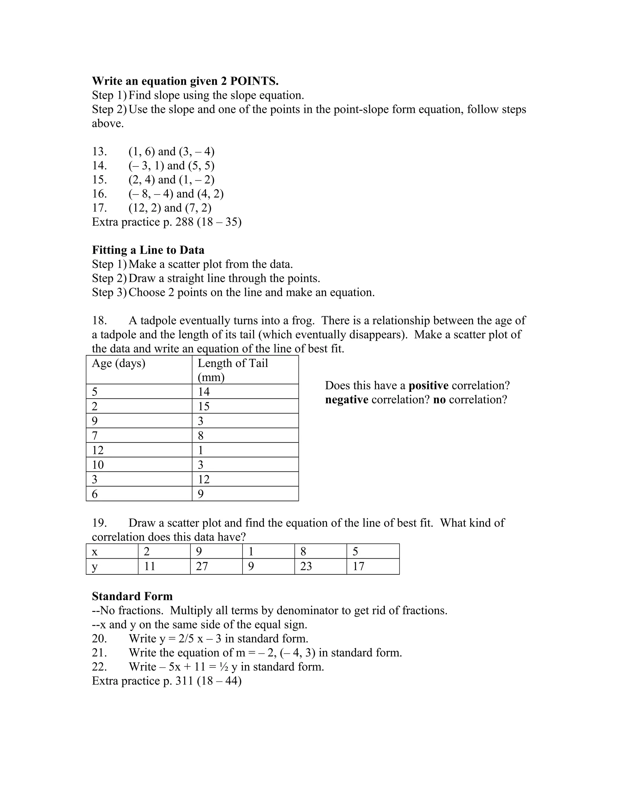 This document provides a study guide for Chapter 5 of Algebra 1 covering slope-intercept form, point-slope form, standard form, writing equations of lines given points or slope, finding parallel and perpendicular lines, and using linear models to fit data. Key concepts covered include the definitions of slope, forms of linear equations, using various forms to write equations of lines, and interpreting linear models from data.