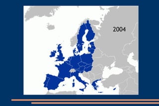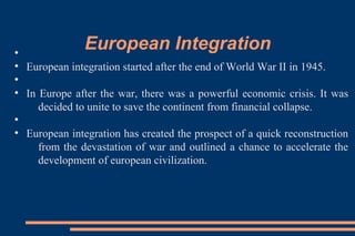 The history of European integration began after World War II to unite Europe economically and prevent future wars. In 1950, the Schuman Declaration proposed a European Coal and Steel Community to pool the industries between France and Germany. This led to the 1951 Treaty of Paris establishing the ECSC. In 1957, the Treaties of Rome created the European Economic Community and Euratom to build a single market. Over subsequent decades, more countries joined and treaties expanded the EU's scope and powers, including the introduction of the euro currency. Today, the EU comprises numerous institutions that work together to determine policy, legislate, administer programs, and more for the economic and political cooperation of member states.
