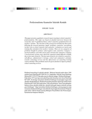 Dokumen ini membentangkan kajian kualitatif mengenai profesionalisme kaunselor sekolah rendah di Malaysia, berdasarkan temu bual dengan 15 kaunselor berkelayakan. Kajian mendapati bahawa masalah yang dibawa oleh pelajar terbahagi kepada dua kategori, di mana kategori kedua melibatkan kes serius yang sukar ditangani akibat empat halangan utama, termasuk efikasi diri kaunselor dan sikap komuniti. Terdapat keperluan mendesak untuk memperbaiki latihan dan peranan kaunselor agar mereka dapat menjalankan tugas secara berkesan.
