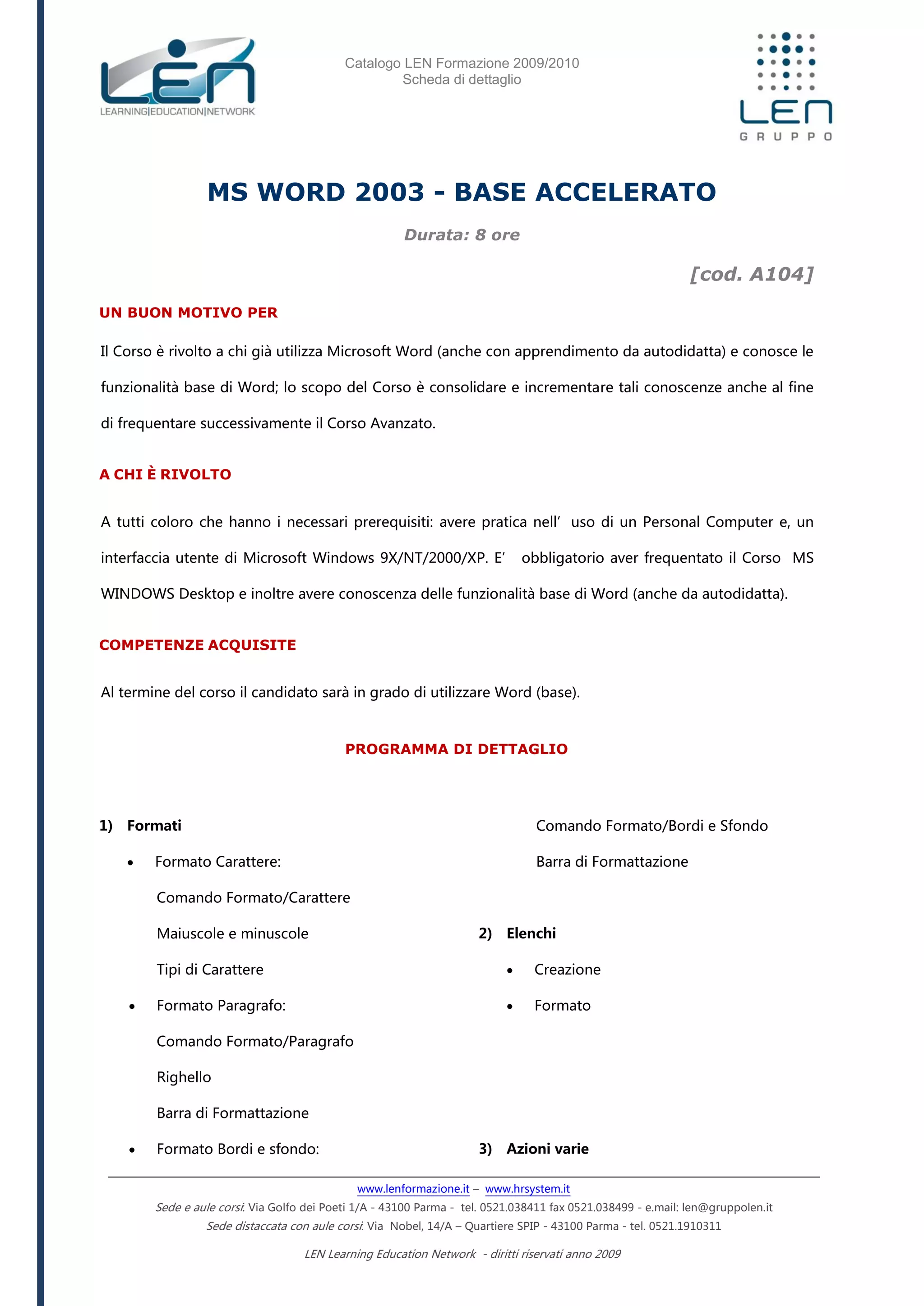 Il documento è un catalogo dei corsi di formazione offerti da Len per l'anno 2009/2010, con focus particolare sul corso base di MS Word di 8 ore. Il corso è rivolto a chi possiede già informazioni di base su Word e mira a potenziare tali competenze, coprendo vari aspetti come formati, elenchi, azioni varie, elementi fuori testo, stampa, tabelle e stampa unione. Sono anche descritti diversi metodi di formazione, tra cui seminari, workshop e corsi di training, con durate variabili.