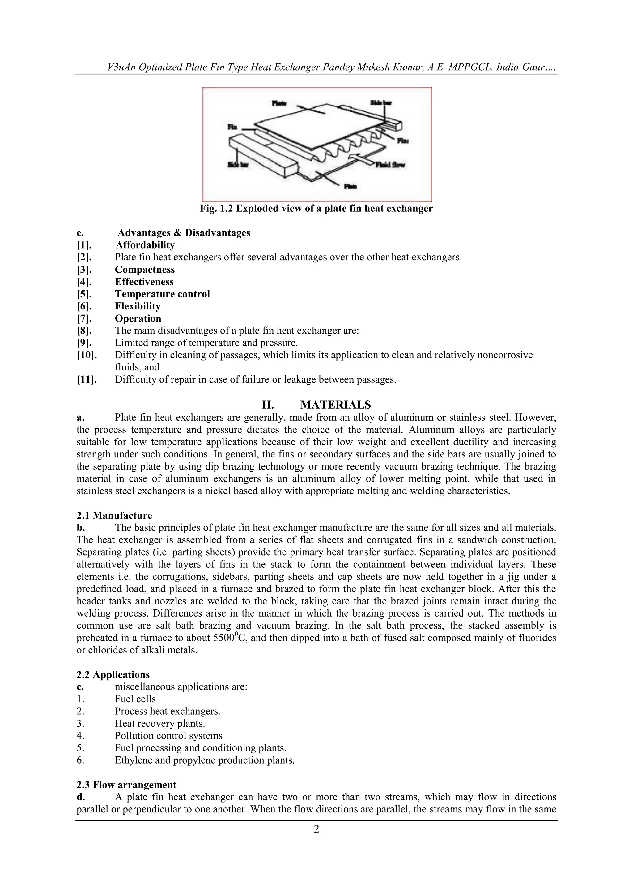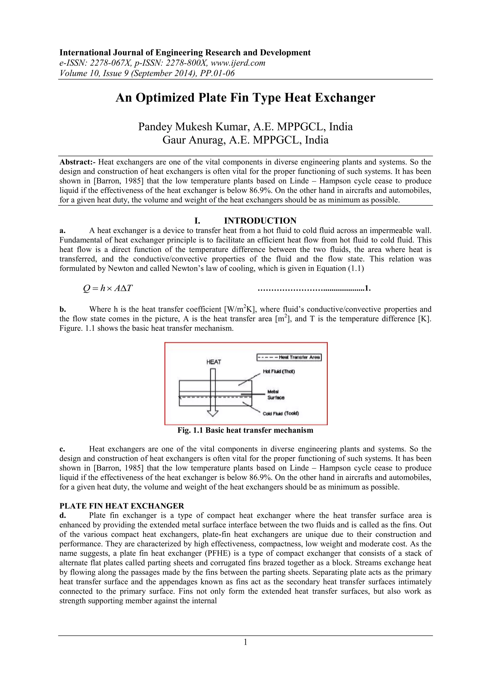 The document discusses the design and performance of plate fin type heat exchangers, highlighting their importance in various engineering applications. It details the operational principles, manufacturing processes, and advantages and disadvantages of these exchangers, as well as presenting experimental results that show their effectiveness and overall heat transfer performance. The study emphasizes the correlation between flow rate, temperature, and effectiveness, establishing that increasing flow rates lead to improved thermal performance.