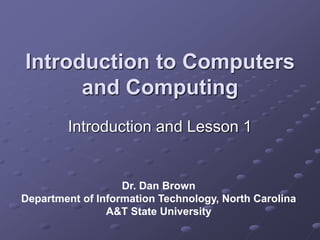 This document provides an introduction and overview of the topics that will be covered in the first lesson of an Introduction to Computers course. The topics include: introducing the lab and its objectives/grading policies, expectations for students and the instructor, how to use the Blackboard website and Common File System (CFS) for file management, and how to access the Steel web server. The document outlines what will be taught regarding file management, Microsoft Office applications, and gaining hands-on experience using computing tools in the lab portion of the course.