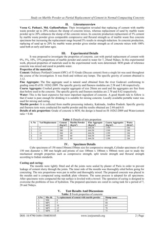 1) The document studies the use of marble powder as a partial replacement for cement in normal compacting concrete.