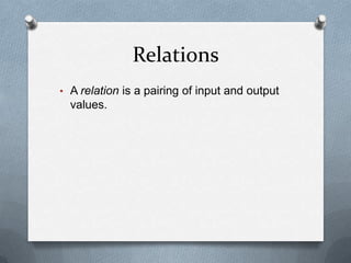 This document discusses linear functions and how to graph them. It defines relations and functions, noting that a function has each input mapped to only one output. It states that a linear function forms a straight line on a graph. Methods for graphing linear functions include creating a table of x- and y-values by plugging inputs into the linear equation and plotting the points, or finding the x- and y-intercepts where the line crosses the axes.