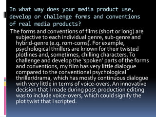 This document provides details about the production and evaluation of a short film created by the author. It discusses how the film challenges conventions of psychological thriller/drama genres through its use of minimal dialogue and voiceovers. Feedback from test audiences is discussed, such as recommendations to improve the audio mixing and reduce the prominence of music. The author explains how research, planning and evaluation were conducted using online resources and film review magazines, and how technologies like iMovie and Ken Burns effects were used in the construction and editing stages.