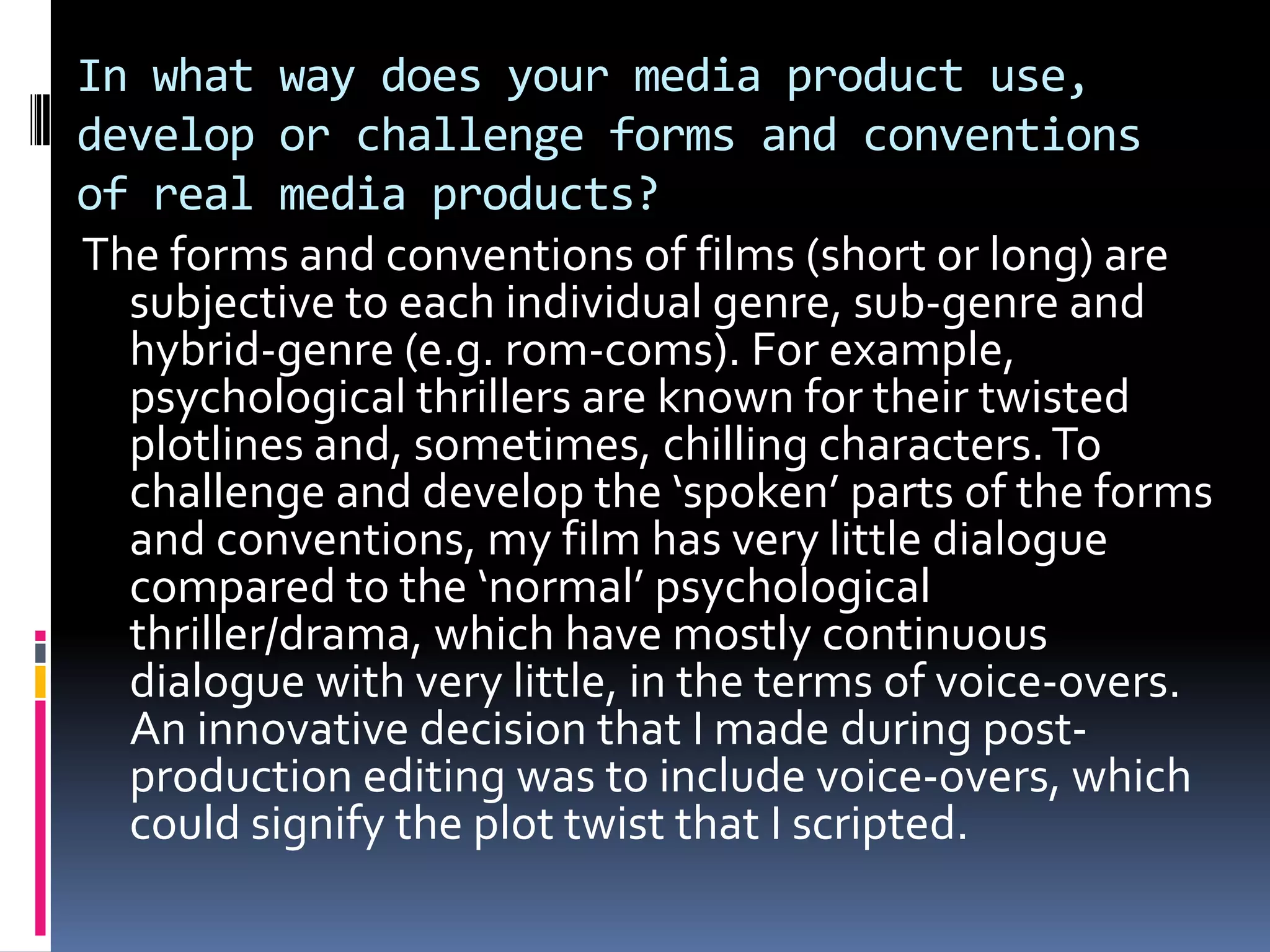 The document discusses the filmmaker's use of media technologies in creating their short film. It describes using iMovie to edit footage, add effects like slow motion and color adjustments. Feedback from test audiences was incorporated, such as turning down music volume. The film was uploaded to TheSmalls.com for distribution. Viewers can leave comments and the site provides analytics on views, comments, favorites and ratings. PowerPoint was used to create an evaluation, then uploaded to slideshare and myPlick to share on a blog.