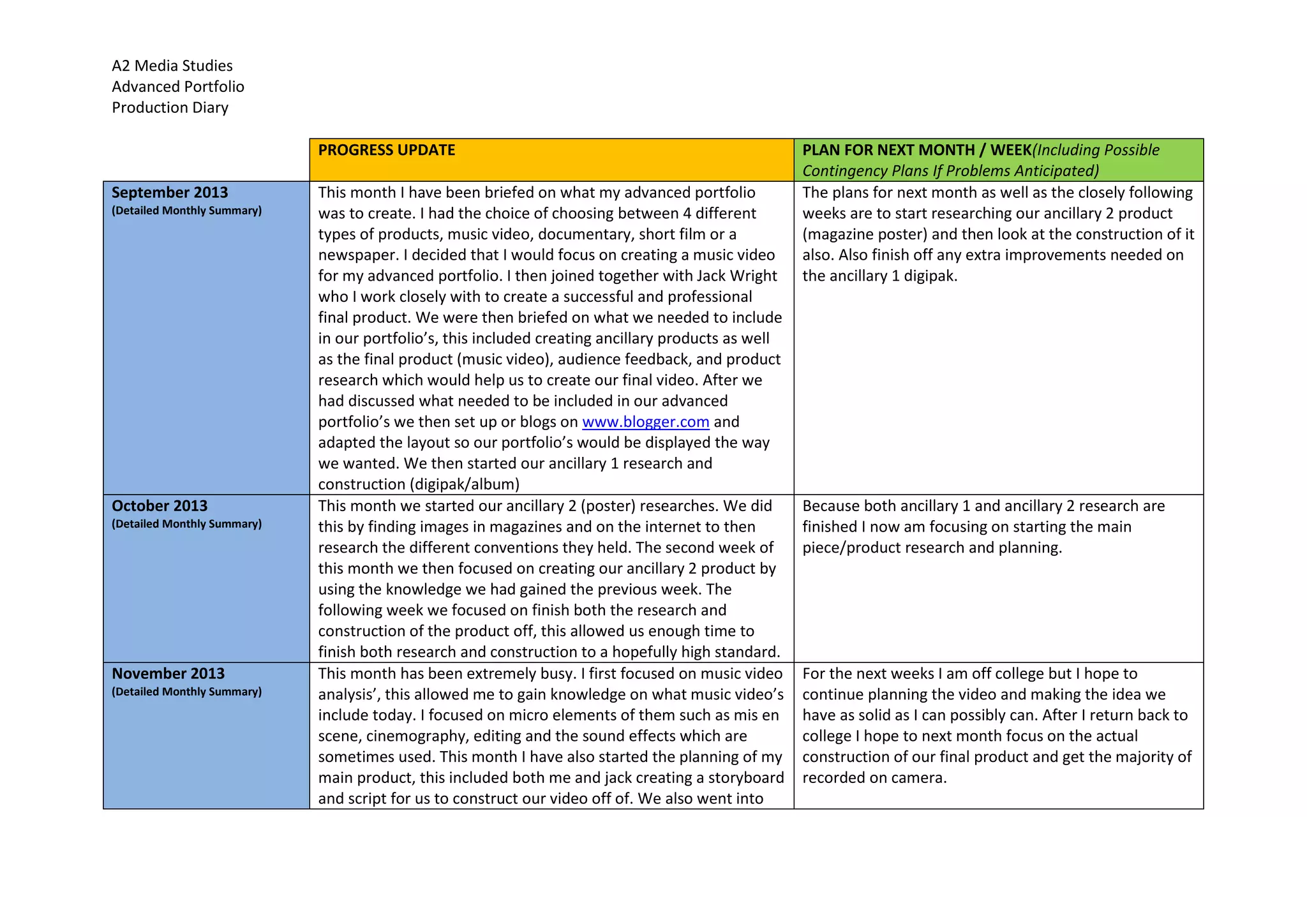 This document is a production diary for an advanced media studies portfolio created over several months. It details the process of researching, planning, shooting, and editing a music video as the main project, along with creating supplementary materials. Over this time, the student worked on pre-production like storyboarding, principal photography of filming scenes in various locations, post-production such as editing in Adobe Premiere, and promotion by uploading the final video to YouTube. The diary outlines goals and plans for each subsequent month and week spent developing the portfolio project.