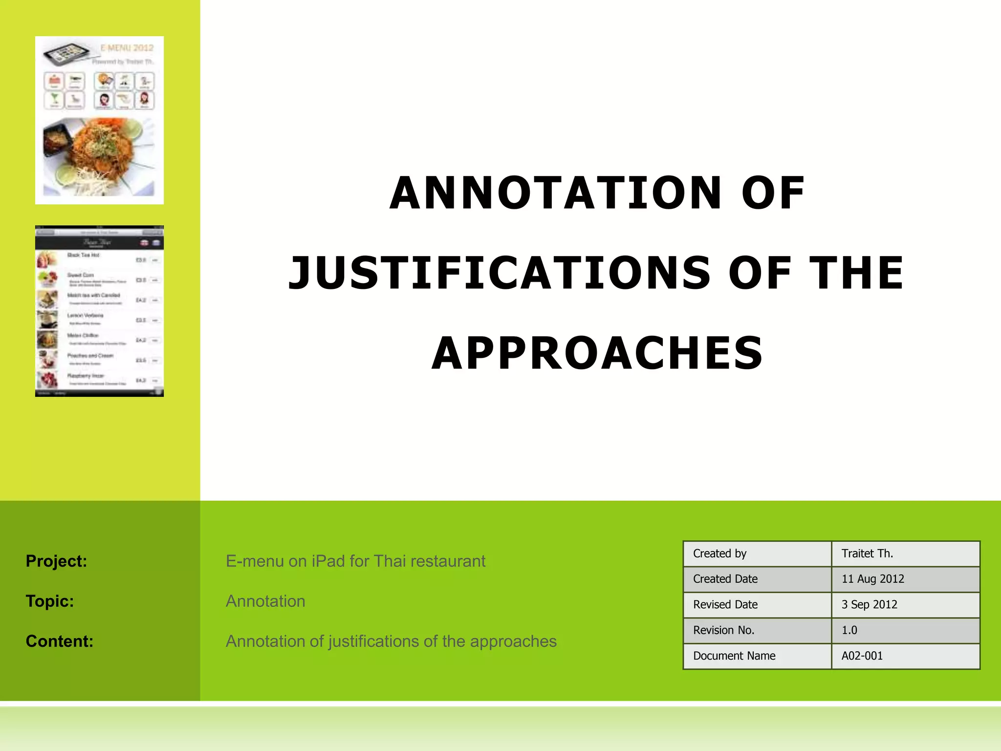 This document provides justifications for the approaches used in a research project to develop an e-menu prototype for a Thai restaurant. It discusses: