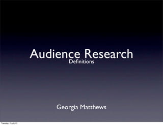 This document defines and discusses different types of research methods including quantitative and qualitative research. It also covers primary and secondary research methods. Specific research methods covered include closed and open questions. The document also discusses the purposes of research including understanding demographics, geodemographics, psychographics, audience profiling, socio-economic status, niche markets, and mainstream audiences.