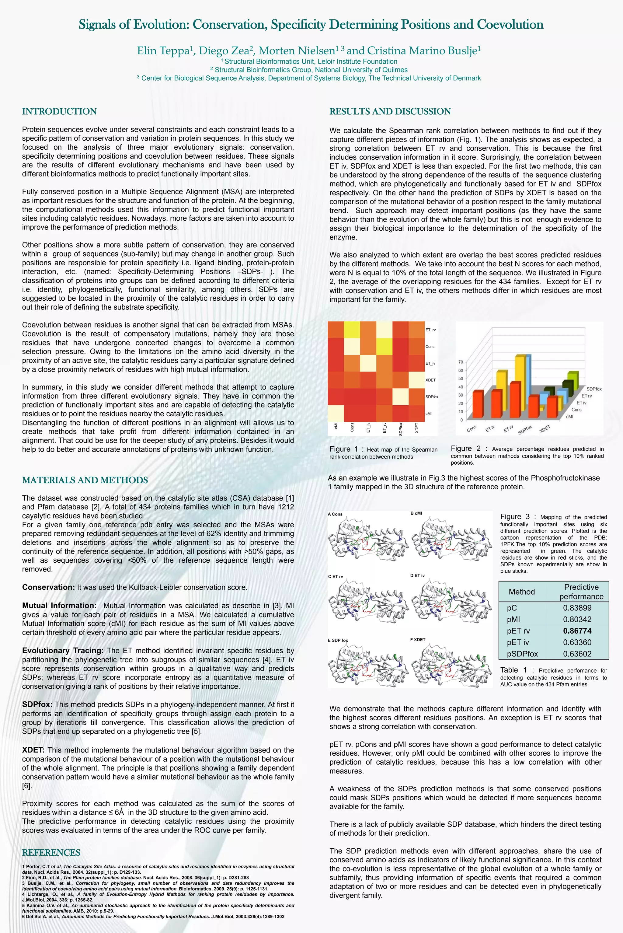 This document summarizes a study that analyzed three major evolutionary signals in protein sequences: conservation, specificity determining positions (SDPs), and coevolution between residues. These signals result from different evolutionary mechanisms and have been used by bioinformatics methods to predict functionally important sites. The study evaluated several methods for predicting conserved residues, SDPs, and coevolving positions using a dataset of 434 protein families. It found that the methods capture different information and identify different top-scoring residues. Conservation and mutual information scores performed best at detecting catalytic residues, but combining scores could improve predictions. SDP prediction remains challenging due to limited data and methods detecting conserved residues may miss SDPs until more sequences are available.