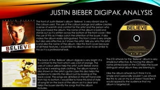 The document analyzes and summarizes the album artwork for Justin Bieber's "Believe" album and Nicki Minaj's "Pink Friday" album. For Justin Bieber's album, the front cover uses orange and yellow colors to create warmth and the album name is bold to catch attention. The back cover contrasts with bright yellow and lists the songs clearly. For Nicki Minaj's album, the front cover prominently features the pink color associated with her and emphasizes her image and the album name. The CD keeps the pink color and house style consistent with her image featured. Both album designs are assessed as simple yet professional with features worth considering for a designer's own album artwork.
