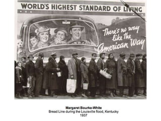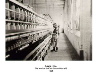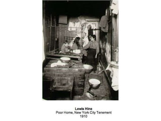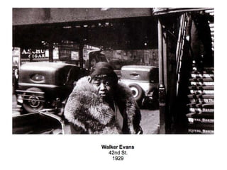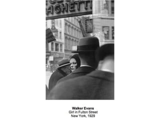 This document discusses documentary photography, including photojournalism that records events for news media, social documentary that focuses on a social group or issue, and war photography that documents conflict. Documentary photography aims to record the truth objectively through images that serve as proof, evidence, and accurate representations of real people and events. The document questions how some photographers, such as James Nachtwey and Don McCullin, have used their work to shine light on important issues and potentially change perspectives according to John Ruskin's view of photography's role. It also provides examples of photographers like Sebastião Salgado, Dorothea Lange, and Lee Miller who have contributed to documentary photography.