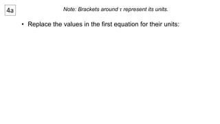The document discusses calculating wind stress and wind speed from equations. It is deduced that the units of wind stress are Pascals (Pa), which is a unit of pressure. Using given values in equations, a wind speed of 16.5 m/s is calculated to produce a drag coefficient of 1.05 x 10-3. Additionally, a wind speed of 22.5 m/s is calculated to produce a wind stress of 4.9 x 10-2 Pa when given values for air density and drag coefficient.