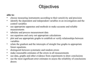 This document provides objectives and guidance for revising physics concepts related to measurement and analysis, including choosing measuring instruments, identifying variables, making measurements, processing data, using equations and graphs, identifying sources of error, and drawing valid conclusions from experimental evidence and results. Key concepts covered include significant figures, sensitivity, precision, accuracy, systematic and random error, and analyzing linear relationships through equations, direct and inverse proportion, and calculating gradients and intercepts from graphs.