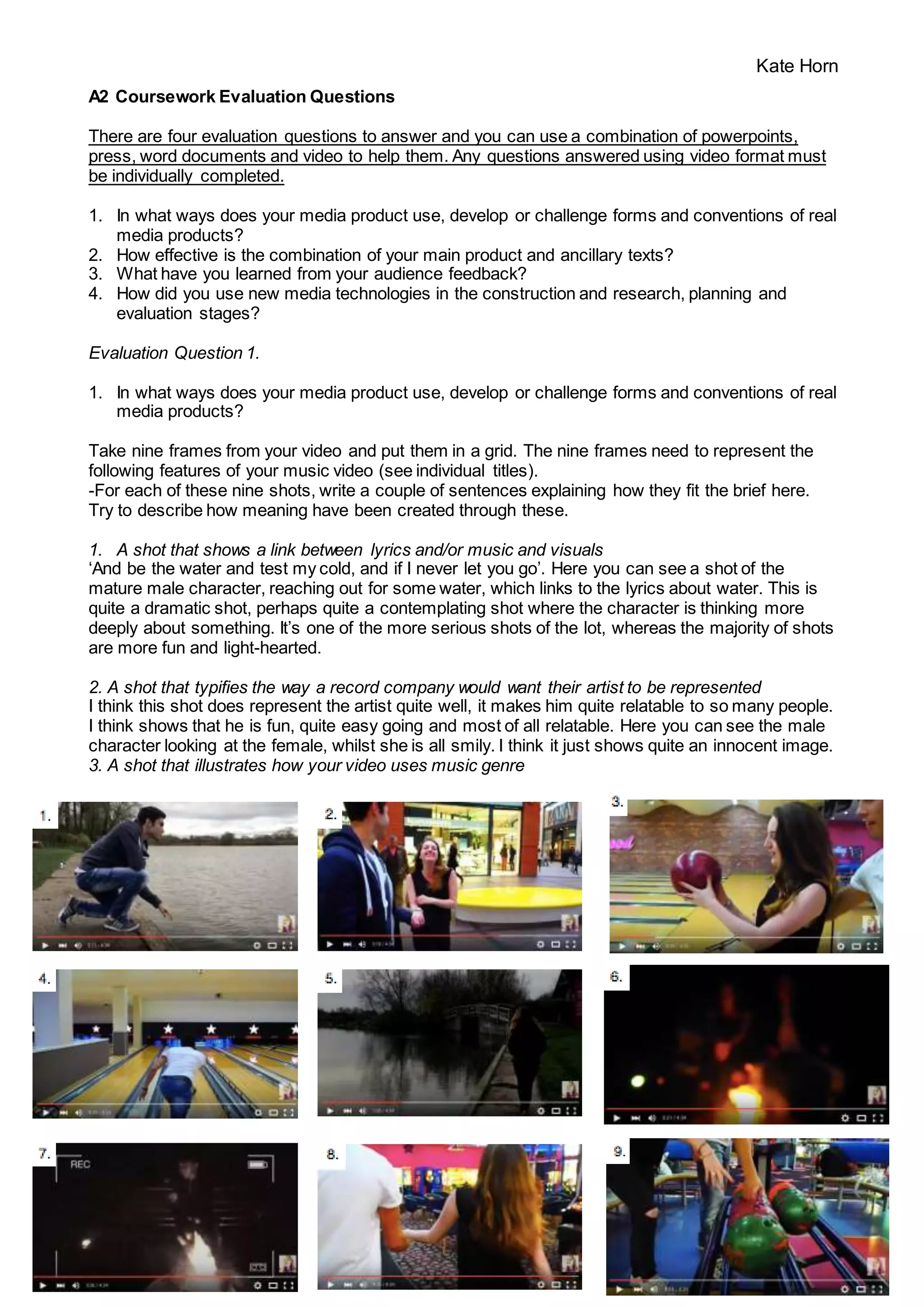 This document provides evaluation questions and instructions for Kate Horn's A2 coursework on creating a media product. It includes four evaluation questions to answer, using a combination of formats like PowerPoints, press articles, word documents, and video. For the first question, Kate is asked to take nine frames from her video and explain how they fit the brief in 2-3 sentences each. She is also asked to take screen grabs from other music videos and provide a similar analysis of how those nine frames meet the brief. The brief focuses on shots that link to lyrics/music, represent the artist, illustrate genre, include intertextual references, demonstrate camera/lighting/mise-en-scene use, and show influences from other music
