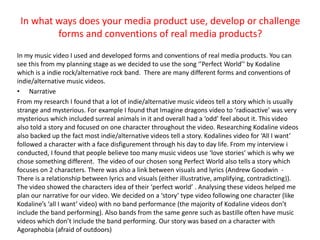 The document summarizes how the media product used and developed conventions of real music videos. It analyzed videos by the band Kodaline to inform the narrative, camera work, mise-en-scene, and surreal elements of the produced video. Audience feedback was gathered through social media to gauge the video's reception. A variety of media technologies were used at different stages, including YouTube, Photoshop, Premier Pro, and blogs for research, planning, construction, and evaluation of the project.