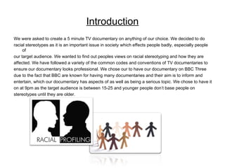 The document describes a 5-minute TV documentary created by the author on the topic of racial stereotypes. It discusses how the documentary uses common conventions of the genre, such as interviews, a voiceover, music, and establishing shots. It also includes a draft and final version of an article created to promote the documentary in a TV magazine.
