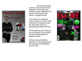 The document discusses the process of creating promotional materials for a film project including a teaser trailer, poster, and magazine cover. It describes analyzing existing examples to understand conventions of the genre. Feedback was gathered from an audience who felt the locations and visuals matched the crime genre. Some elements like the magazine cover background could be improved. Overall, technology played an important role in research, production, and editing the final materials.