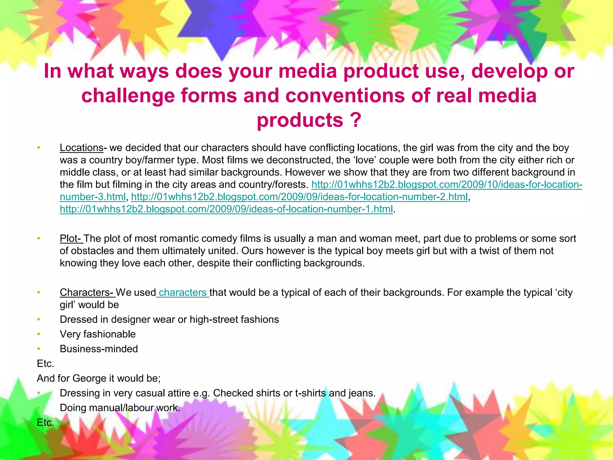 This document evaluates a media project involving a teaser trailer for a romantic comedy film. It discusses how the project challenged conventions in its use of conflicting character backgrounds (city girl and country boy), plot structure (characters not realizing they love each other despite differences), and original soundtrack. Feedback from an audience helped the creators understand preferences and expectations around genre and character types. A variety of new media technologies were used in researching, planning, constructing, and evaluating the project, including the internet, YouTube, video/still cameras, iMovie, and Garageband.