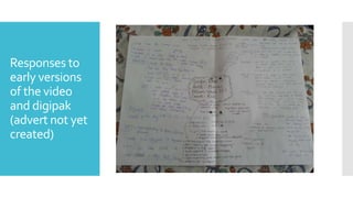 The document discusses feedback received on early versions of a student's music video and digipak project. It describes improvements made based on the feedback, such as improving lighting and linking the digipak and video narratives. A survey was distributed to gather additional feedback. Most respondents liked the animation and live-action combination in the video. The artist's face was favored on the digipak cover and album advert for gaining attention. Most interpreted the video differently than the intended meaning. The majority agreed the artist's image effectively promoted them through the products.