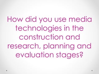 The document discusses the various media technologies used by Charlotte Simcox at each stage of constructing and evaluating her music video project. She used her IMac computer throughout for software like Microsoft Word, Prezi, and iMovie. She also used YouTube for research, planning, construction, and evaluation. Other technologies used included Slideshare, PowerPoint, Facebook, a USB, Blogger, Google, and Prezi. The document provides details on how each technology was used and its benefits and limitations.