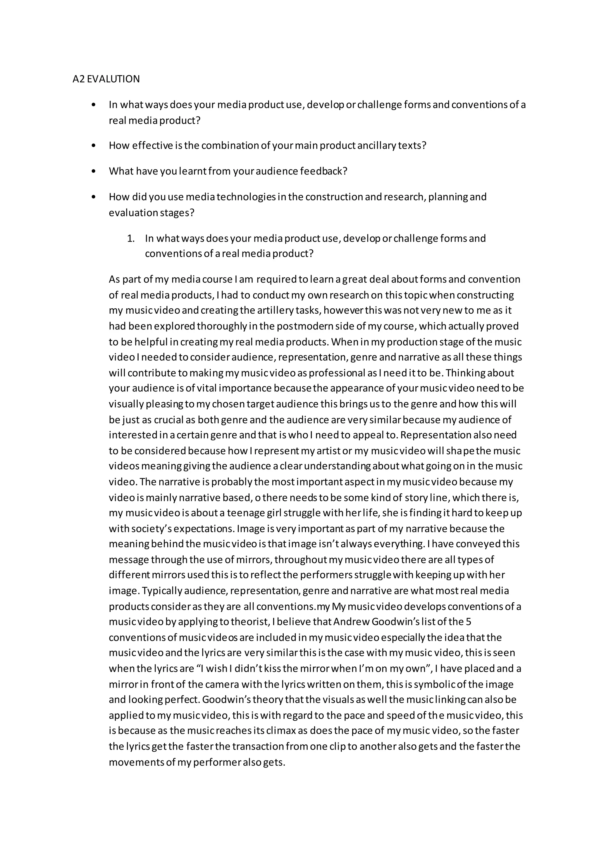 This document summarizes the evaluation of a media product created by the author. It discusses how the media product uses and develops conventions of real music videos through considerations of audience, representation, genre, narrative and the use of mirrors as a theme. The effectiveness of combining the main music video with ancillary texts like magazine ads and a digipack is also assessed. Details are provided about the research, planning and use of technology in creating the media product, including the camera and editing software used.
