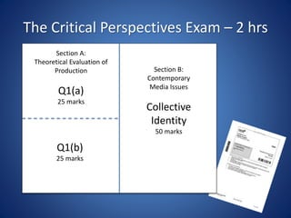 This document provides guidance for answering Question 1(a) on an exam about media production. Question 1(a) requires students to describe and evaluate their skills development over multiple projects in one or two specific areas, such as digital technology, research/planning, post-production, use of conventions, or creativity. The document provides details on each of these skills areas and advises on how to structure the answer by introducing the selected skills, discussing early projects, later projects, and concluding with demonstrated development. Sample questions are included to check understanding of the question requirements.