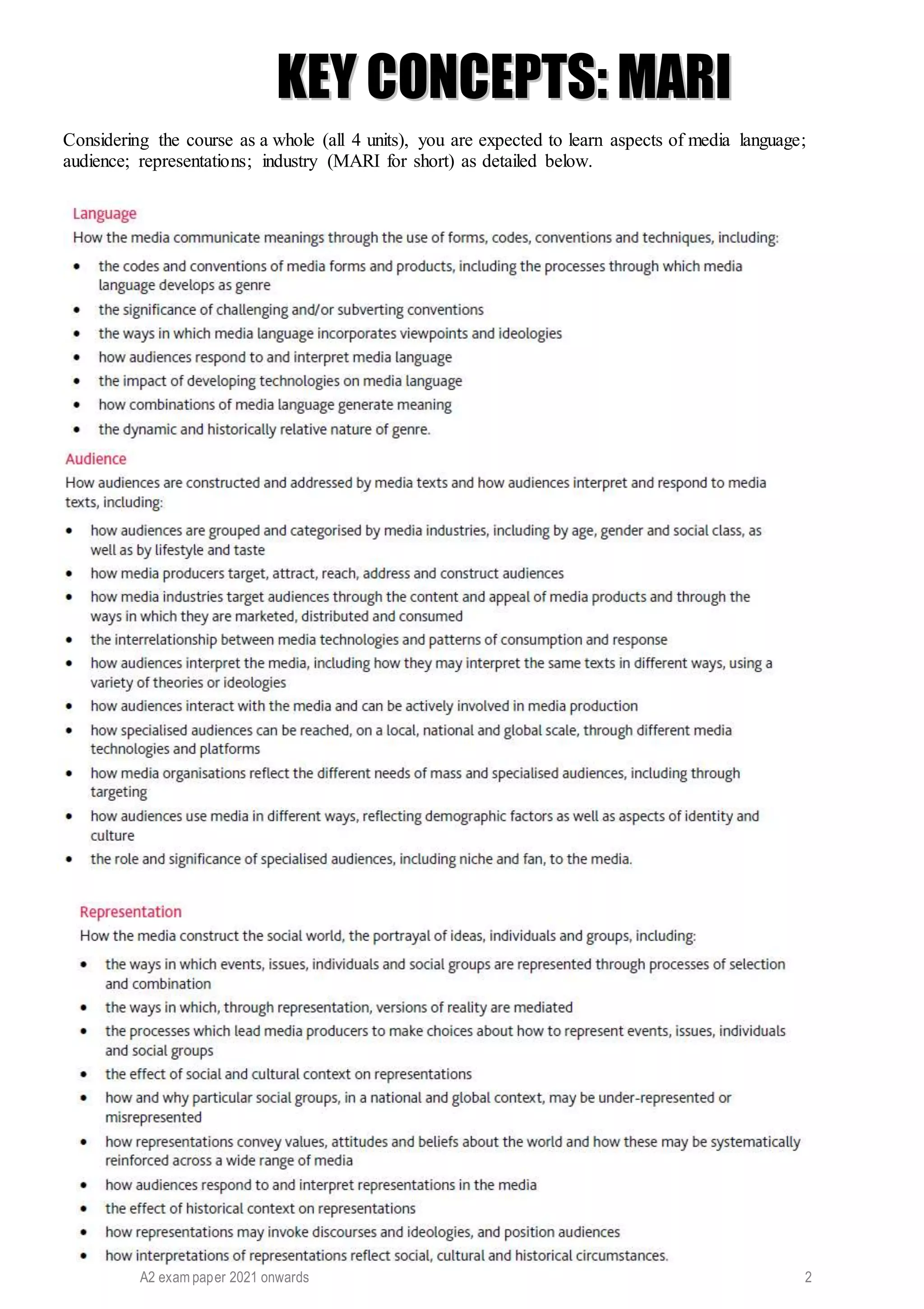 The document summarizes the structure and content of the A2 exam for media studies. It contains the following information: