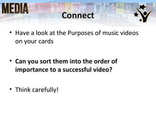 This document discusses codes and conventions in music videos. It defines codes as the established ways of creating meaning in a text, including technical, verbal, and symbolic codes. Conventions are commonly understood ways of doing things in a genre. The document instructs students to identify codes and conventions in various music videos, such as the use of purple pills in a D12 video, and to analyze how two videos in the same genre use codes and conventions to effectively promote the artist. Students are then asked to define codes and conventions on their blog and compare two videos, analyzing the codes, conventions, promotional success, and relative success of each.