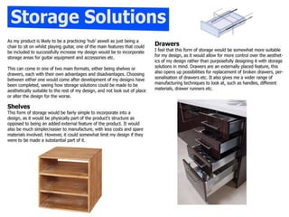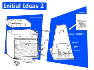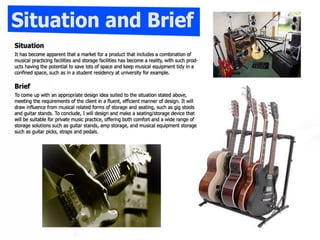 This document outlines a research plan and initial design process for a music product. It includes: