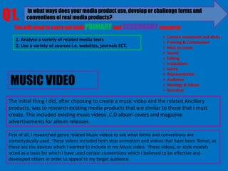 The document discusses the process of creating a music video and its related products, focusing on the use of stop animation and filmed scenes to enhance visual appeal and narrative coherence. It details the planning stages, including researching existing music videos and selecting a song, specifically 'Naive' by The Kooks, for its alignment with the target audience and suitability for stop animation. Moreover, it outlines the design of ancillary products like a CD cover and magazine advertisement, emphasizing branding consistency through color schemes, fonts, and imagery.
