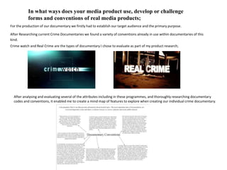 Our documentary uses conventions of real crime documentaries like interviews and a variety of shots. Audience research found they prefer real CCTV footage. The documentary includes conventions like interviews, shots of Manchester, and a local voiceover to connect with the target audience. Ancillary texts like a magazine review and billboard help promote the documentary. Audience feedback noted good sound and information but could improve lighting and include a reconstruction. Media technologies like Adobe Premiere were used to edit video, add titles, and manipulate footage to form a narrative. Overall skills in film editing, blogging, and using media sites improved through producing this documentary.